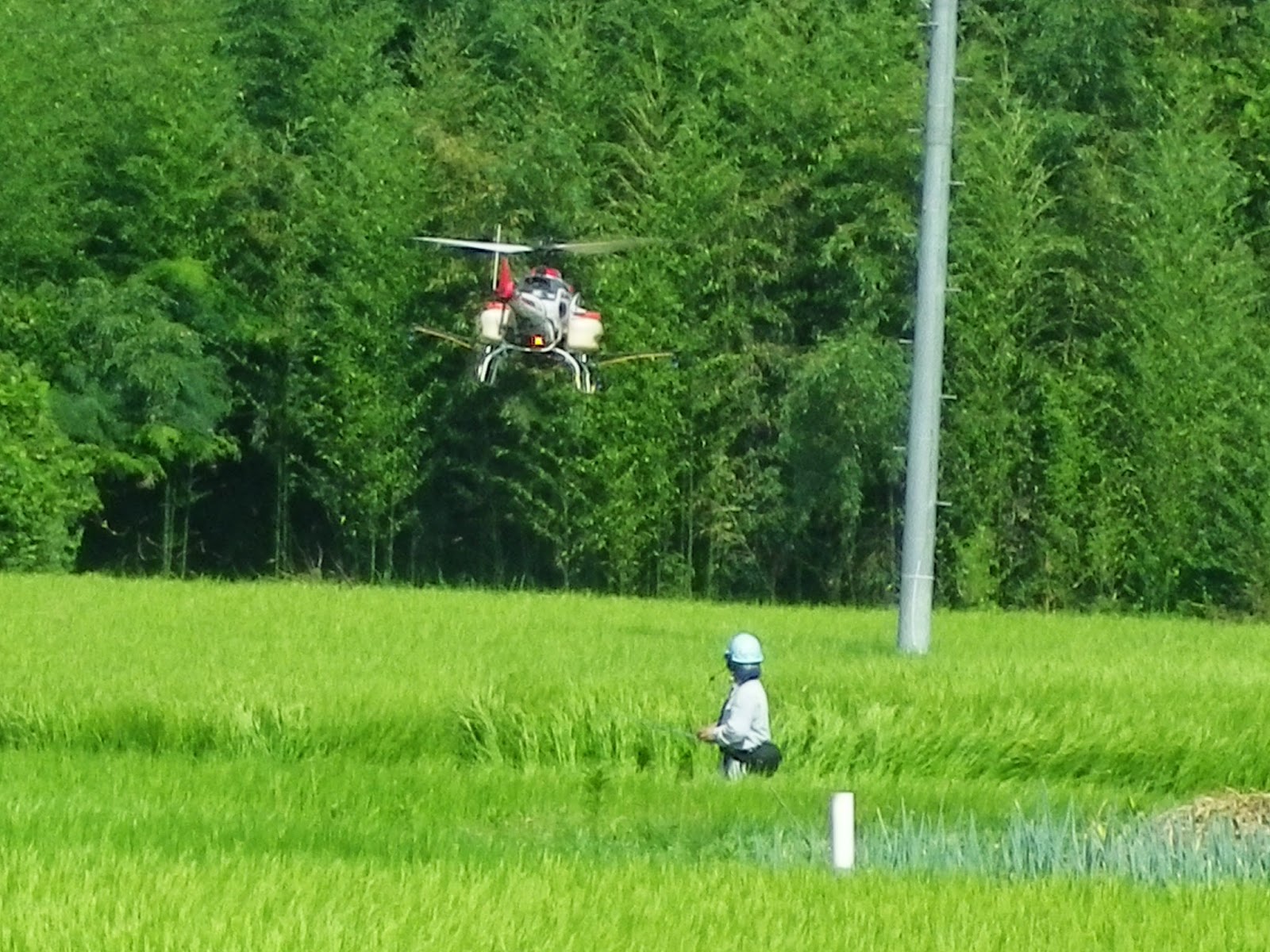 操縦担当者が田の畔を動き回りながら、ほぼ田んぼ一枚毎といってもよいほど、低空飛行して丁寧に散布する。
